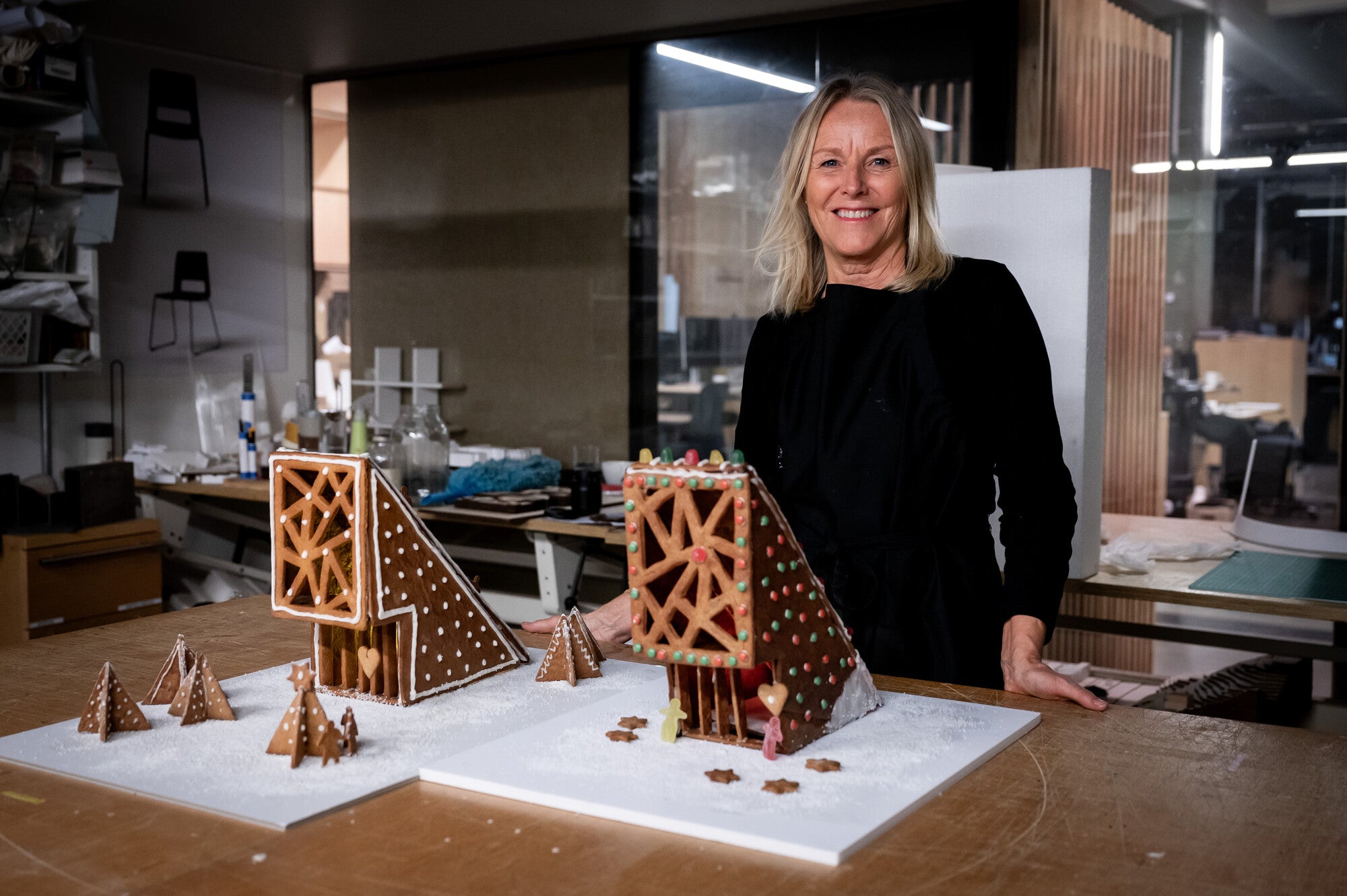 “Vi har lagt vekt på å gi pepperkakehuset en morsom og litt utradisjonell form. Det har et dobbelhøyt rom med en stor og generøs takflate som kan pyntes og befolkes. Frontfasaden har perforerte flater som kan reflektere lyset på en stemningsfull måte. Utenfor kan man lage en liten pepperkakeskog med pepperkaketrær. Vi håper pepperkakehuset vil få en fin plass hjemme hos dere. Kanskje kan dere sette et lite elektrisk lys inne i huset? Da kan pepperkakehuset stå og skinne i mørket og minne oss på at alt vi egentlig ønsker oss, er en fredelig verden.